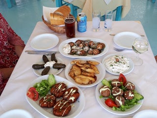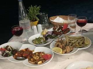 Karışık deniz ürünleri tabağı(çupra,hamsi,kılıç balığı,karides,kalamar,midye)güzel. karışık meze tabağı lezzetli. Ahtapot ızgara güzel. Poseidon salata, 2 şişe uzo ve kahve 4 kişi bunların hepsi 94 €